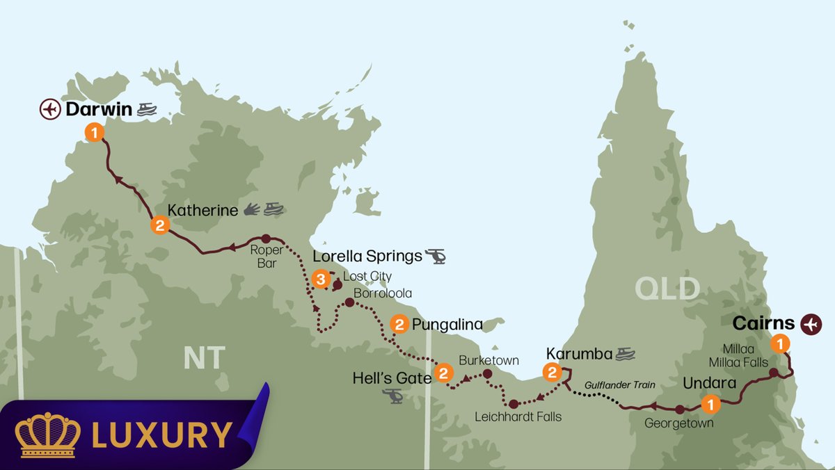 Embark on an unforgettable 15-day, all-inclusive adventure through Northern Australia from Cairns to Darwin. Highlights include a scenic helicopter flight and Calvert River cruise, a three-night stay at the sprawling Lorella Springs Wilderness Park, and exploration of the Southern Lost City in Limmen National Park, complete with helicopter access and guided walks. You’ll also journey through the majestic lava tubes of Undara Volcanic National Park with a night stay in a unique train-carriage accommodation and enjoy a magical sunset dinner cruise on the Gulf of Carpentaria